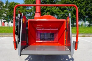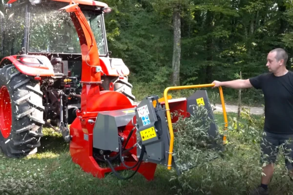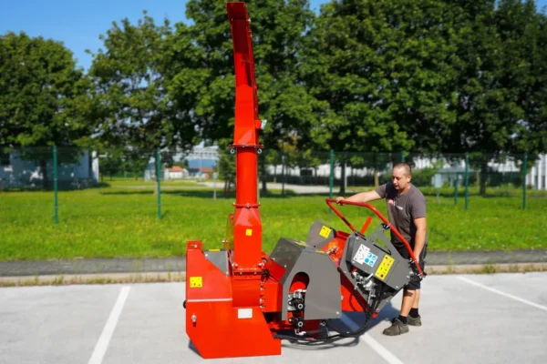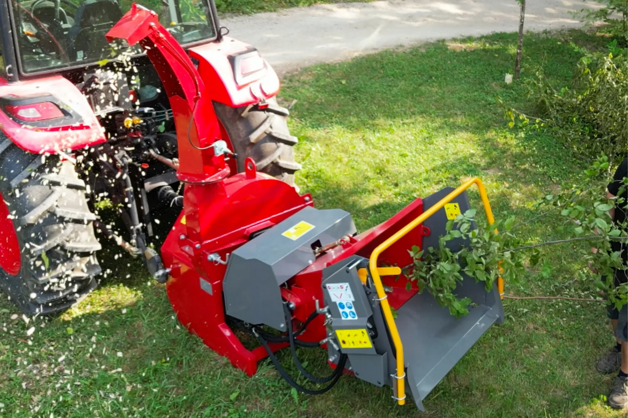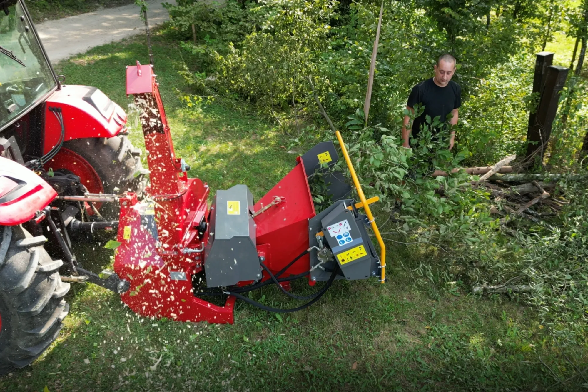 Široka odprtina 43 × 25 cm omogoča podajanje razvejanega lesa, drobilni disk z 4 + 1 noži (kontra nož) pa učinkovito obdeluje veje do premera Ø 25 cm. Z nastavitvijo kontra noža lahko prilagodite debelino sekancev — od grobih za kurivo do finejših za kompost ali zastirko.