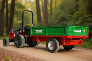 Opremljena je s tristranskim kipanjem, kar omogoča raztovarjanje na vse tri strani. Zaviranje je izvedeno s hidravlično in ročno zavoro, po želji pa je na voljo tudi z zračno zavoro. Priklop je nastavljiv po višini, kar omogoča prilagoditev različnim traktorjem. Prikolica je opremljena s pnevmatikami dimenzije 10.0–75 / 15.3 z 12 plastmi in je primerna za hitrosti 30 ali 40 km/h. Opcijsko so na voljo štirje notranji privezi za varen prevoz mini bagrov.