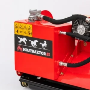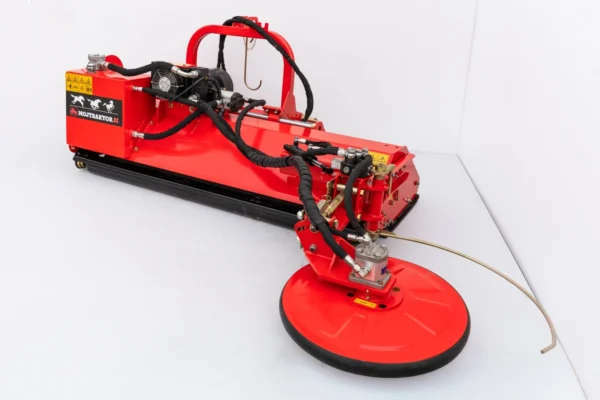 Osnovna delovna širina mulčarja znaša 195 cm, dodatni bočni disk širine 60 cm pa omogoča košnjo med vrstami in tik ob deblih. Disk je hidravlično odmikan, kar pomeni, da se ob stiku z oviro samodejno umakne in se po prehodu vrne v delovni položaj. Takšna rešitev omogoča hitro, tekoče in varno delo tudi v gostih in dolgih vrstah vinogradov ter sadovnjakov, kjer je natančnost ključnega pomena.
