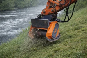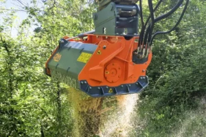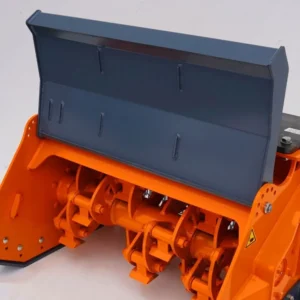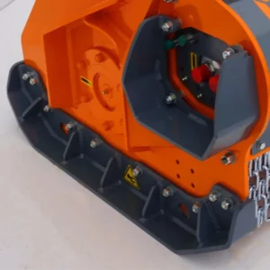 Ohišje je dodatno ojačano z dvojnim dnom, kar povečuje odpornost proti udarcem in obrabi. Notranje zobate palice izboljšujejo drobljenje materiala, nastavljivo odpiranje pokrova rotorja pa omogoča prilagoditev glede na gostoto vegetacije in delovne pogoje. Hidravlični motor in pogonski elementi so zaščiteni v notranjosti ohišja, antikavitacijski ventil pa skrbi za stabilen pretok olja brez potrebe po dodatni drenažni cevi.