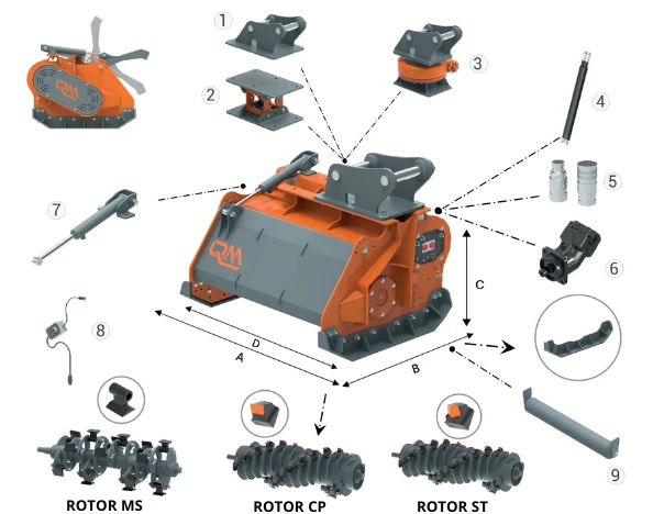 Model je na voljo z različnimi izvedbami rotorjev glede na namen uporabe. Izvlečna kladiva MS so primerna za travo in lažjo vegetacijo, fiksni karbidni zobje CP za mešane pogoje, izvedba ST pa za zahtevnejše drobljenje debelejšega lesa. Podporne sanke omogočajo stabilno delovanje in nastavitev višine reza, robustna zaščita ohišja pa zmanjšuje obrabo pri intenzivni rabi.