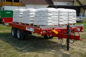 Za dodatno uporabnost je prikolica opremljena s hidravličnim kipanjem nazaj, ki olajša razkladanje določenih vrst tovora. Varnost pri vožnji zagotavlja kombinacija hidravlične in ročne zavore, po potrebi pa je na voljo tudi zračna zavora, kar omogoča prilagoditev različnim traktorjem in delovnim pogojem. Dvojna kolesa s pnevmatikami 235/75 R17.5 poskrbijo za odlično stabilnost, dobro lego na cesti in zanesljivo vožnjo do 40 km/h, tudi pri polni obremenitvi.